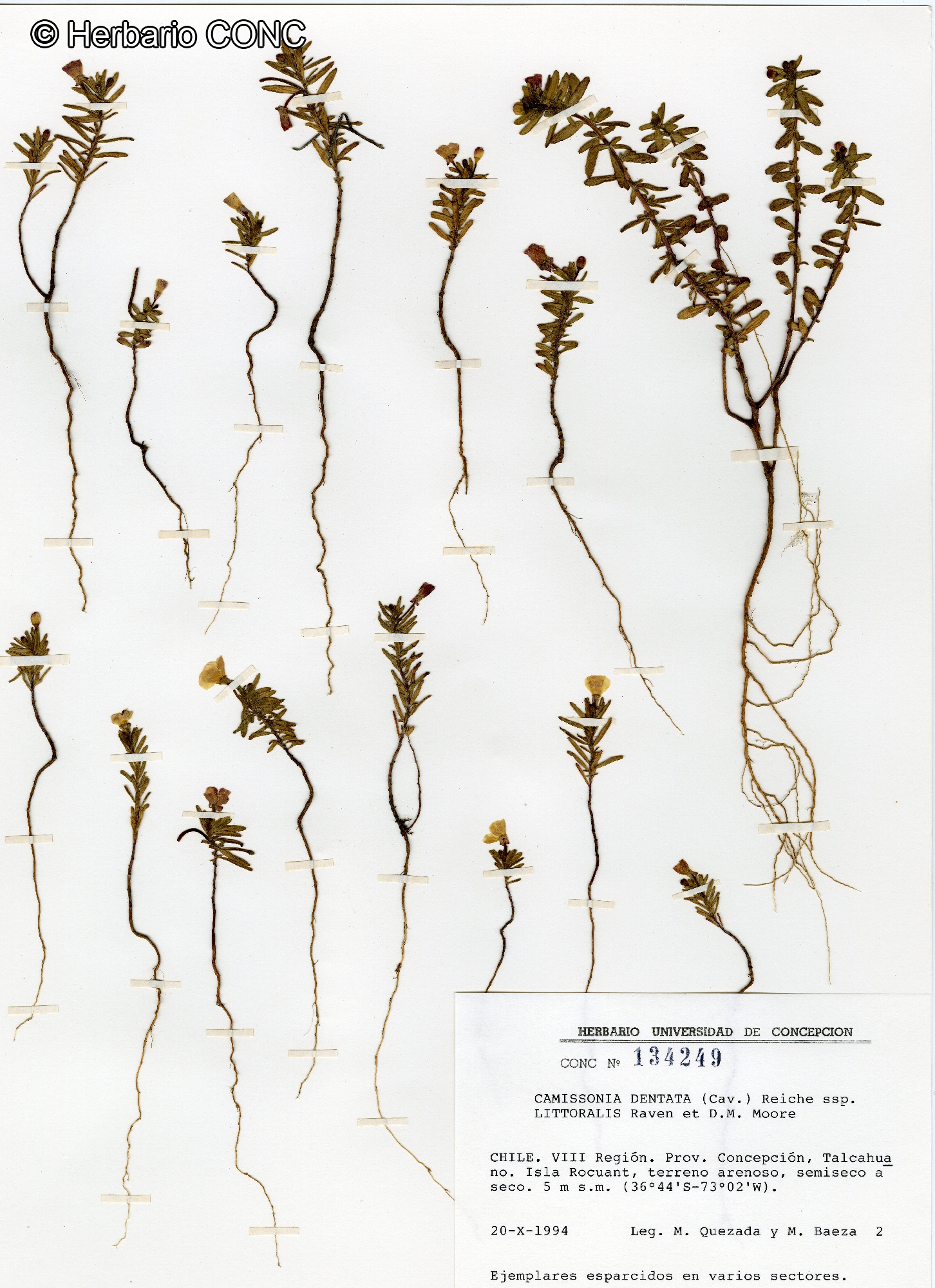 Oenothera dentata Cav., Camissonia dentata (Cav.) Reiche subsp. littoralis P.H. Raven & D.M. Moore, Sphaerostigma acuminatum Phil.,Oenothera contorta Douglas var. divaricata (Gay) Munz, Chamissonia tenuifolia (Spach) Reiche, Camissonia flava Link, Oenothera chamissonis Link, Holostigma argutum Spach, Holostigma heterophyllum Spach, Sphaerostigma chamissonis (Link) Fisch. & C.A. Mey., Oenothera minutiflora D. Dietr., Sphaerostigma dentatum (Cav.) Gay, Sphaerostigma divaricatum Gay, Sphaerostigma ramosissimum Phil., Chamissonia acuminata (Phil.) Reiche, Chamissonia paradoxa (Spach) Reiche var. divaricata (Gay) Reiche, Oenothera torulosa H. Lév. fma. chilensis (D. Dietr.) H. Lév., Oenothera micrantha Spreng. var. acuminata (Phil.) Munz, Sphaerostigma heterophylla (Spach) Gay