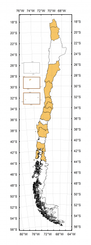 Arica y Parinacota (AYP), Tarapacá (TAR), Atacama (ATA), Coquimbo (COQ), Valparaíso (VAL), Metropolitana (RME), O'Higgins (LBO), Maule (MAU), Biobío (BIO), Araucanía (ARA), Los Lagos (LLA), Juan Fernández (JFE), Rapa Nui (IPA)