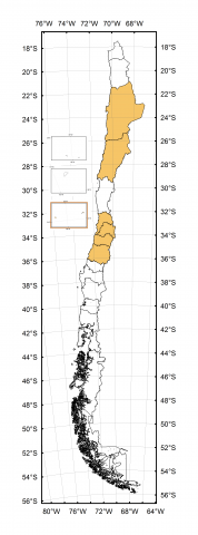 Antofagasta (ANT), Atacama (ATA), Valparaíso (VAL), Metropolitana (RME), O'Higgins (LBO), Maule (MAU), Juan Fernández (JFE)