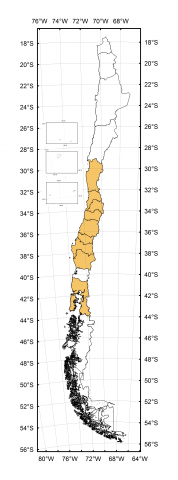 Coquimbo (COQ), Valparaíso (VAL), Metropolitana (RME), O'Higgins (LBO), Maule (MAU), Ñuble (NUB), Biobío (BIO), Araucanía (ARA), Los Lagos (LLA)