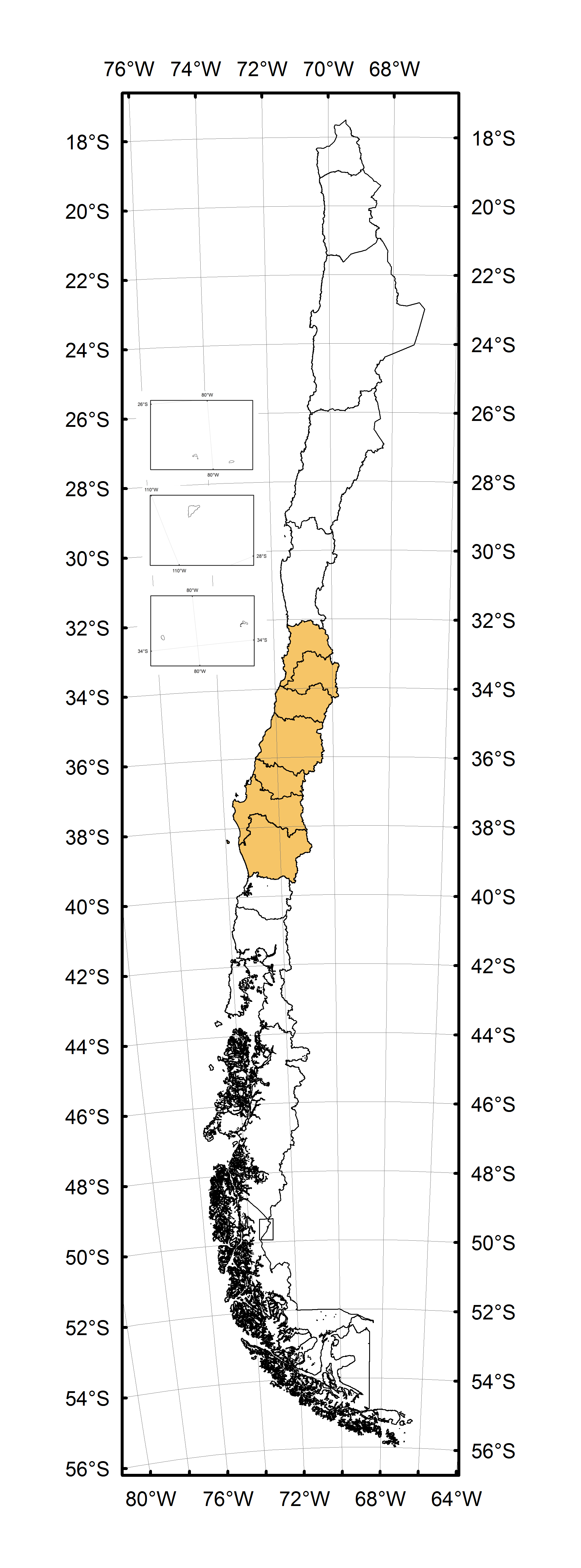 Valparaíso (VAL), Metropolitana (RME), O'Higgins (LBO), Maule (MAU), Ñuble (NUB), Biobío (BIO), Araucanía (ARA)