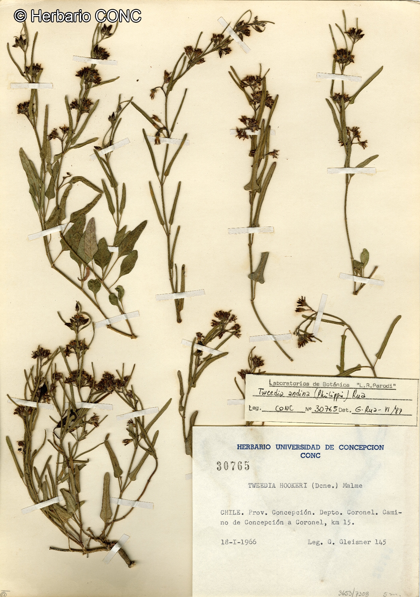 Tweedia hookeri (Decne.) Malme, Oxypetalum andinum Phil., Oxypetalum hookeri Decne., Oxypetalum mölleri Phil.