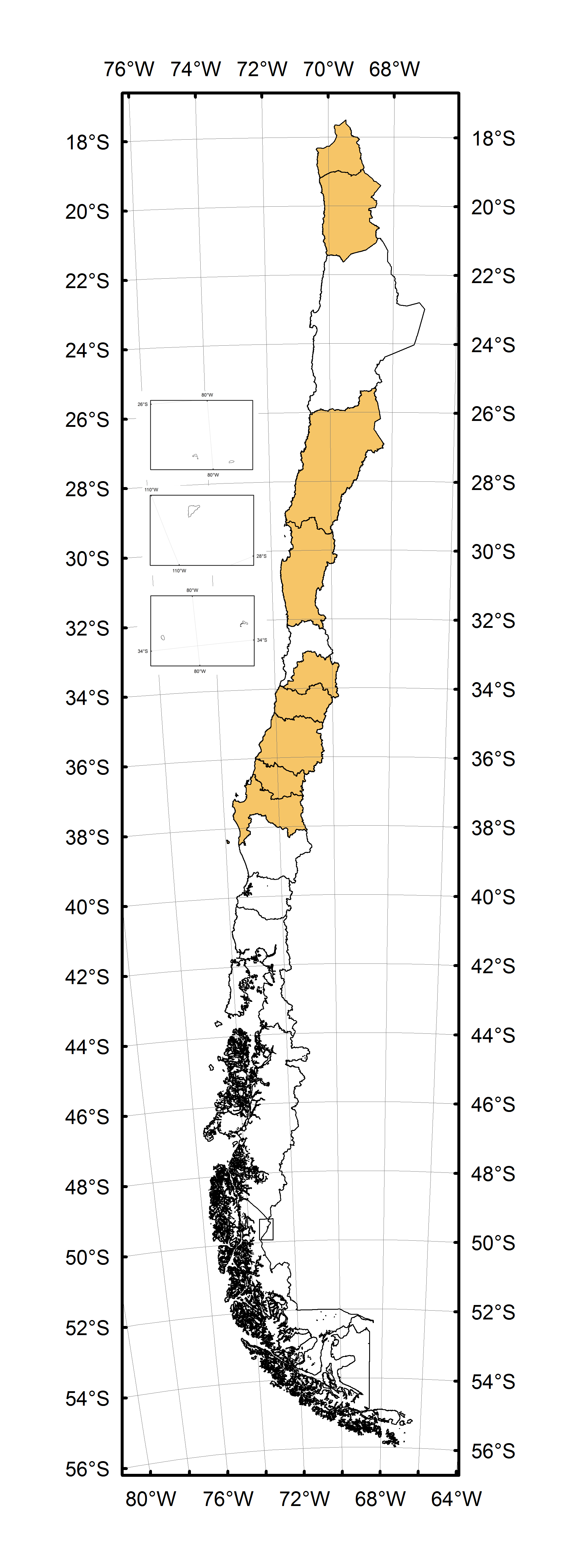 Arica y Parinacota (AYP), Tarapacá (TAR), Atacama (ATA), Coquimbo (COQ), Metropolitana (RME), O'Higgins (LBO), Maule (MAU), Ñuble (NUB), Biobío (BIO)