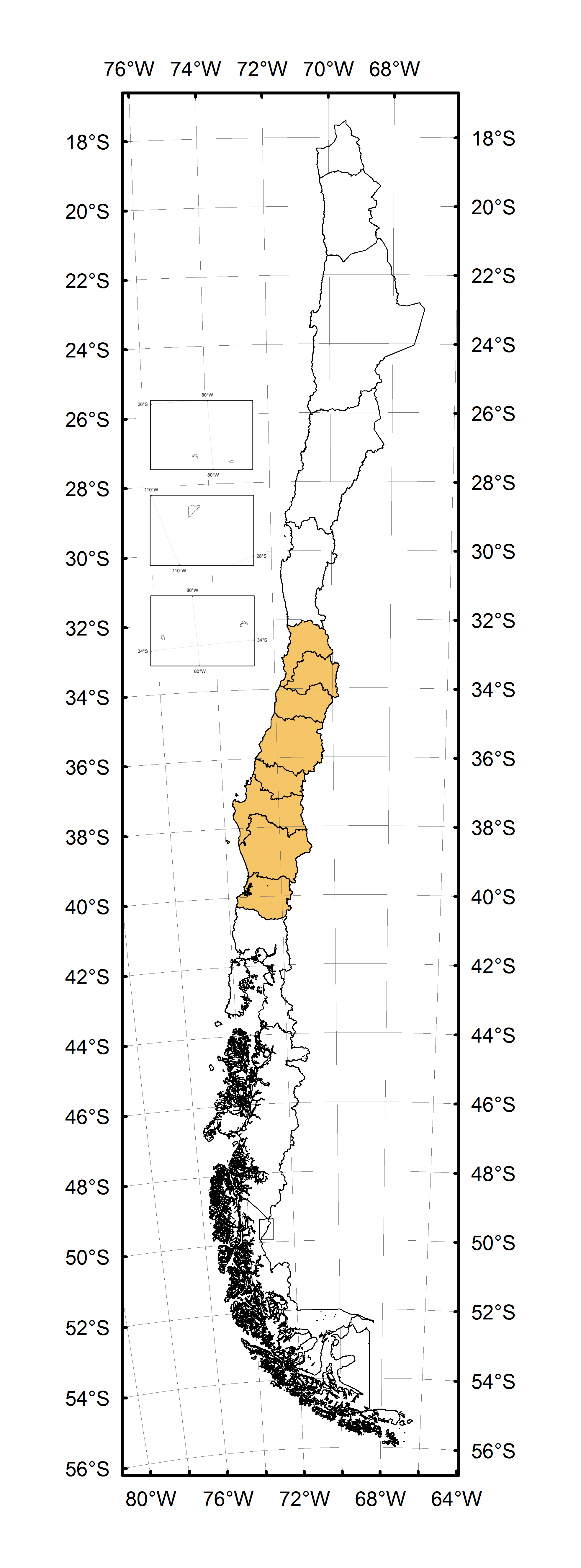 Valparaíso (VAL), Metropolitana (RME), O'Higgins (LBO), Maule (MAU), Ñuble (NUB), Biobío (BIO), Araucanía (ARA), Los Ríos (LRI)