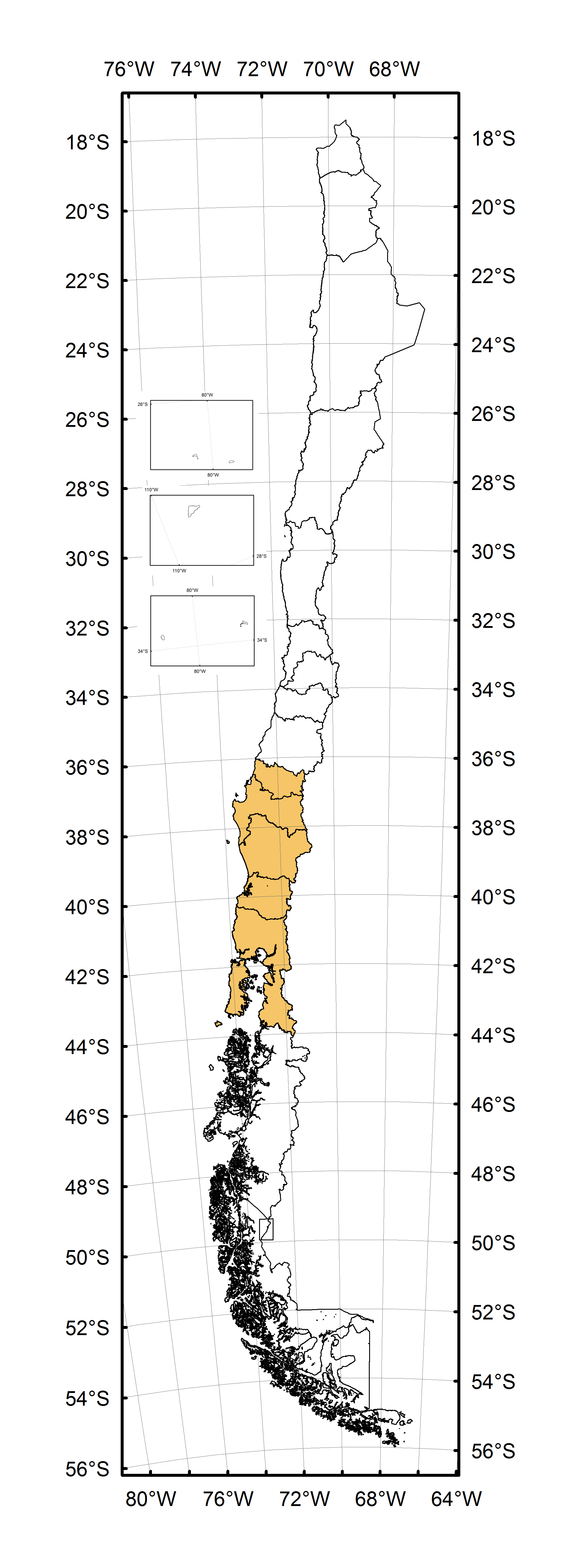 Ñuble (NUB), Biobío (BIO), Araucanía (ARA), Los Ríos (LRI), Los Lagos (LLA)