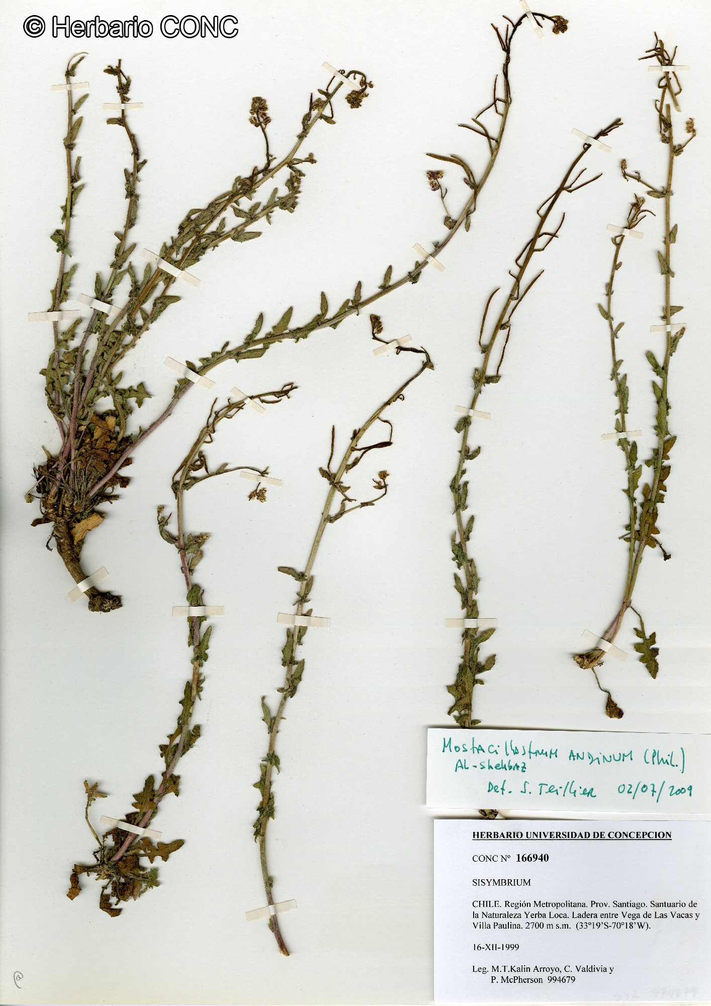 Sisymbrium corymbosum Phil., Sisymbrium corymbosum Phil. var. consanguineum (Phil. ex Reiche) O.E. Schulz, Hesperis andina (Phil.) Kuntze, Sisymbrium andinum Phil. fma. dolichocarpum Hauman, Sisymbrium andinum Phil. var. latifolium Phil., Sisymbrium andinum Phil. var. morenoanum (Chodat & Wilczek) O.E. Schulz, Sisymbrium sagittatum Hook. & Arn. var. andinum (Phil.) Speg., Sisymbrium sagittatum Hook. & Arn. var. latifolium (Phil.) Speg., Sisymbrium andinum Phil., Sisymbrium amplexicaule Phil. var. corymbosum (Phil.) Reiche, Hesperis corymbosa (Phil.) Kuntze, Sisymbrium consanguineum Phil. ex Reiche