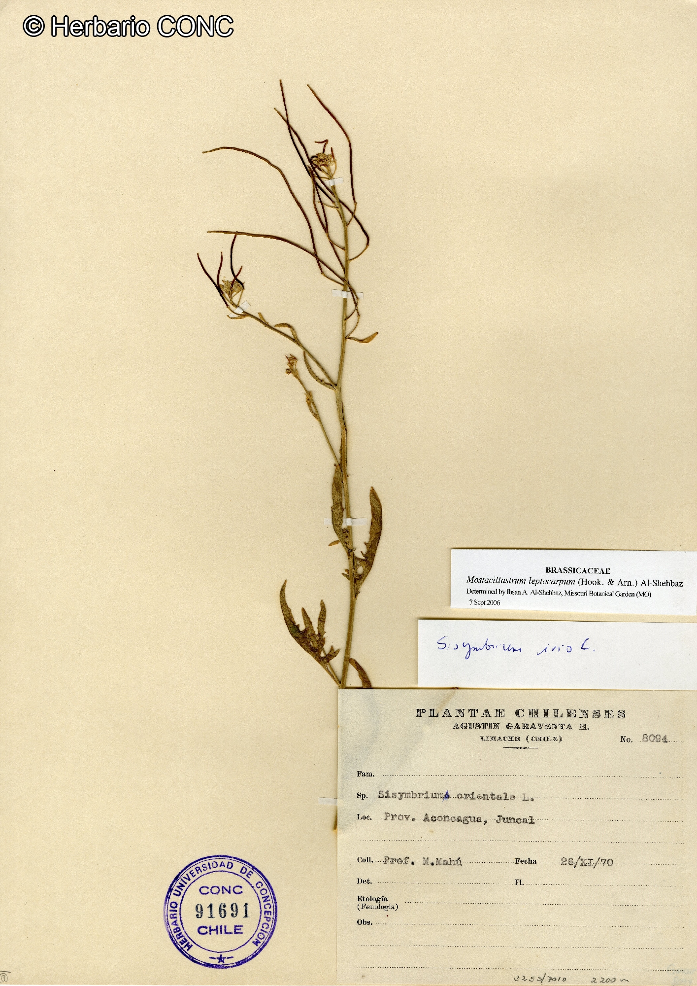 Sisymbrium andinum Phil. var. hastatum (Phil.) O.E. Schulz, Sisymbrium andinum Phil. var. juncalense O.E. Schulz, Hesperis leptocarpa (Hook. & Arn.) Kuntze, Sisymbrium hastatum Phil., Sisymbrium leptocarpum Hook. & Arn., Sisymbrium gayanum Barnéoud, Nasturtium hastatum Phil.