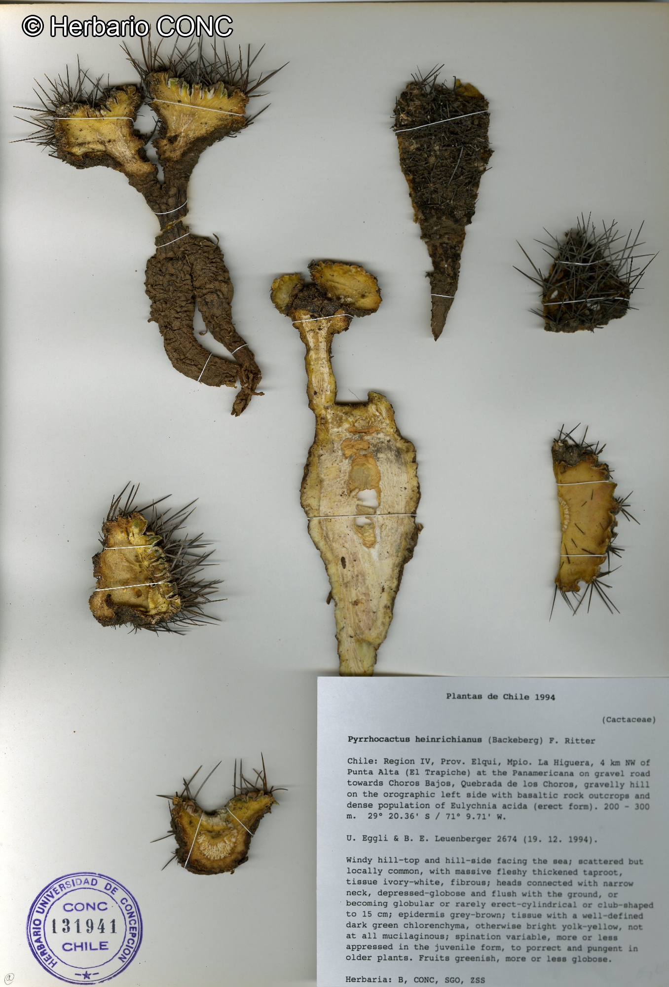 Pyrrhocactus heinrichianus (Backeb.) F. Ritter, Pyrrhocactus chaniarensis F. Ritter, Pyrrhocactus jussieui (Monv. ex Salm-Dyck) Britton & Rose var. australis F. Ritter, Pyrrhocactus jussieui (Monv. ex Salm-Dyck) Britton & Rose var. spinosior F. Ritter, Pyrrhocactus setosiflorus F. Ritter var. intermedius F. Ritter, Pyrrhocactus trapichensis F. Ritter, Pyrrhocactus wagenknechtii F. Ritter, Neoporteria chorosensis (F. Ritter) Donald & G.D. Rowley, Neoporteria deherdtiana (Backeb.) Donald & G.D. Rowley, nom. illeg., Neoporteria dimorpha (F. Ritter) Donald & G.D. Rowley, Neoporteria jussieui (Monv. ex Salm-Dyck) Britton & Rose, Neoporteria jussieui (Monv. ex Salm-Dyck) Britton & Rose var. chaniarensis (F. Ritter) A.E. Hoffm., Neoporteria jussieui (Monv. ex Salm-Dyck) Britton & Rose var. chorosensis (F. Ritter) A.E. Hoffm., Neoporteria jussieui (Monv. ex Salm-Dyck) Britton & Rose var. dimorpha (F. Ritter) A.E. Hoffm., Neoporteria jussieui (Monv. ex Salm-Dyck) Britton & Rose var. setosiflora (F. Ritter) A.E. Hoffm., Neoporteria jussieui (Monv. ex Salm-Dyck) Britton & Rose var. trapichensis (F. Ritter) A.E. Hoffm., Neoporteria jussieui (Monv. ex Salm-Dyck) Britton & Rose var. wagenknechtii (F. Ritter) A.E. Hoffm., Neoporteria occulta (Phil.) Britton & Rose, Neoporteria ritteri Donald & G.D. Rowley, Neoporteria setosiflora (F. Ritter) Donald & G.D. Rowley, Eriosyce heinrichiana (Backeb.) Katt. subsp. intermedia (F. Ritter) Katt., Eriosyce heinrichiana (Backeb.) Katt. var. setosiflora (F. Ritter) Katt., Pyrrhocactus setosiflorus F. Ritter, Chilenia occulta (Phil.) Backeb., Echinocactus occultus Phil., Chilenia jussieui (Monv. ex Salm-Dyck) Backeb.