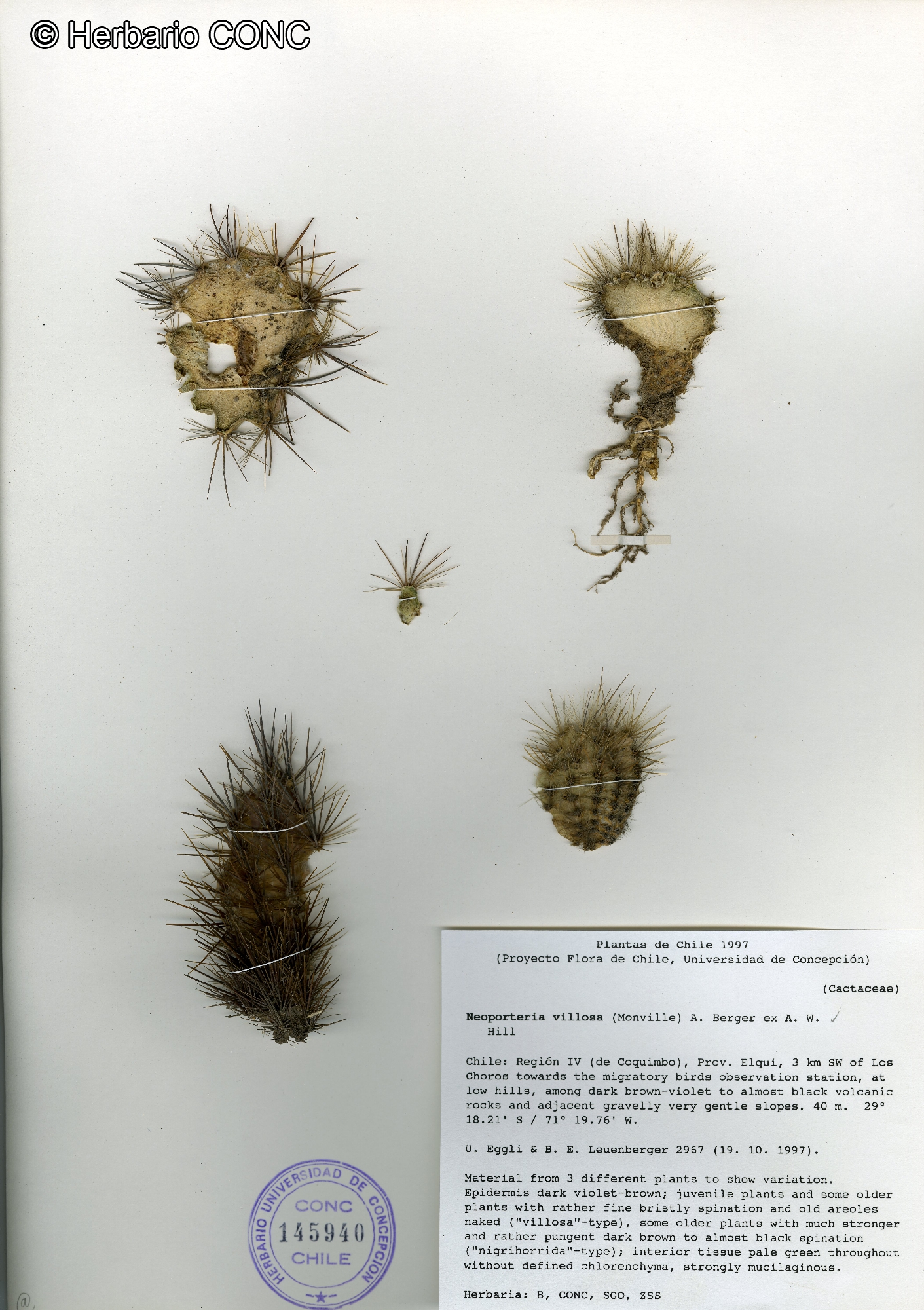 Neoporteria villosa (Monv.) A. Berger, Neoporteria laniceps F. Ritter, Neoporteria villosa (Monv.) A. Berger var. laniceps (F. Ritter) A.E. Hoffm., Cactus villosus Monv., Neoporteria atrispinosa Backeb., Echinocactus villosus (Monv.) Labour.