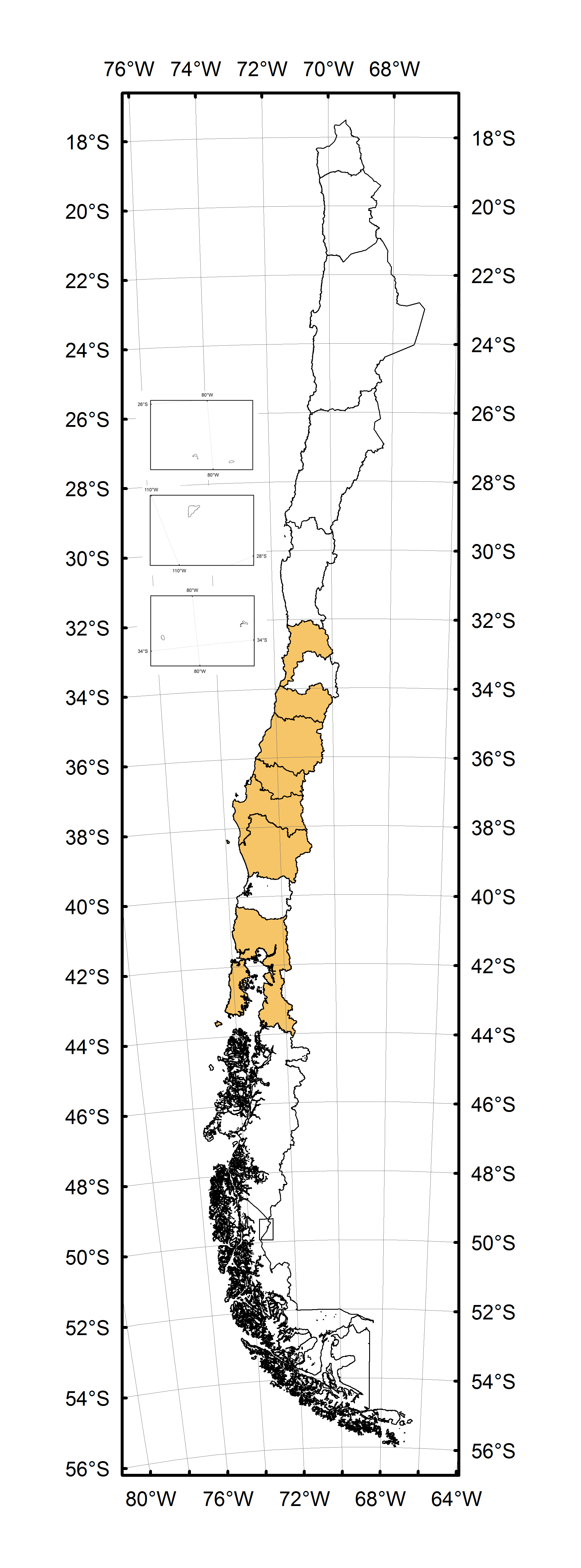 Valparaíso (VAL), O'Higgins (LBO), Maule (MAU), Ñuble (NUB), Biobío (BIO), Araucanía (ARA), Los Lagos (LLA)